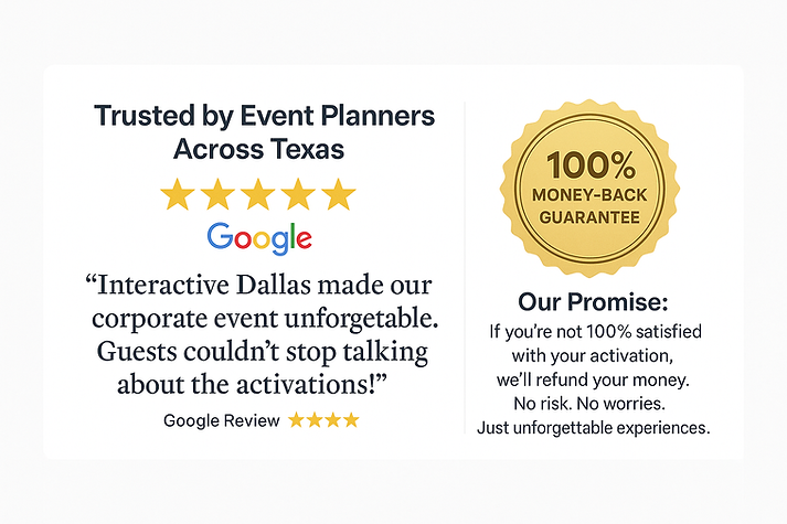 We offer AI Photo Booths, GlamBot, Digital Graffiti Walls, LED Installations, custom event activations, and holiday-themed experiences tailored to Dallas audiences.