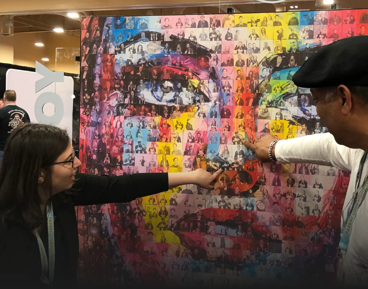 Selfies from attendees form a giant sponsor logo or fair-related image.